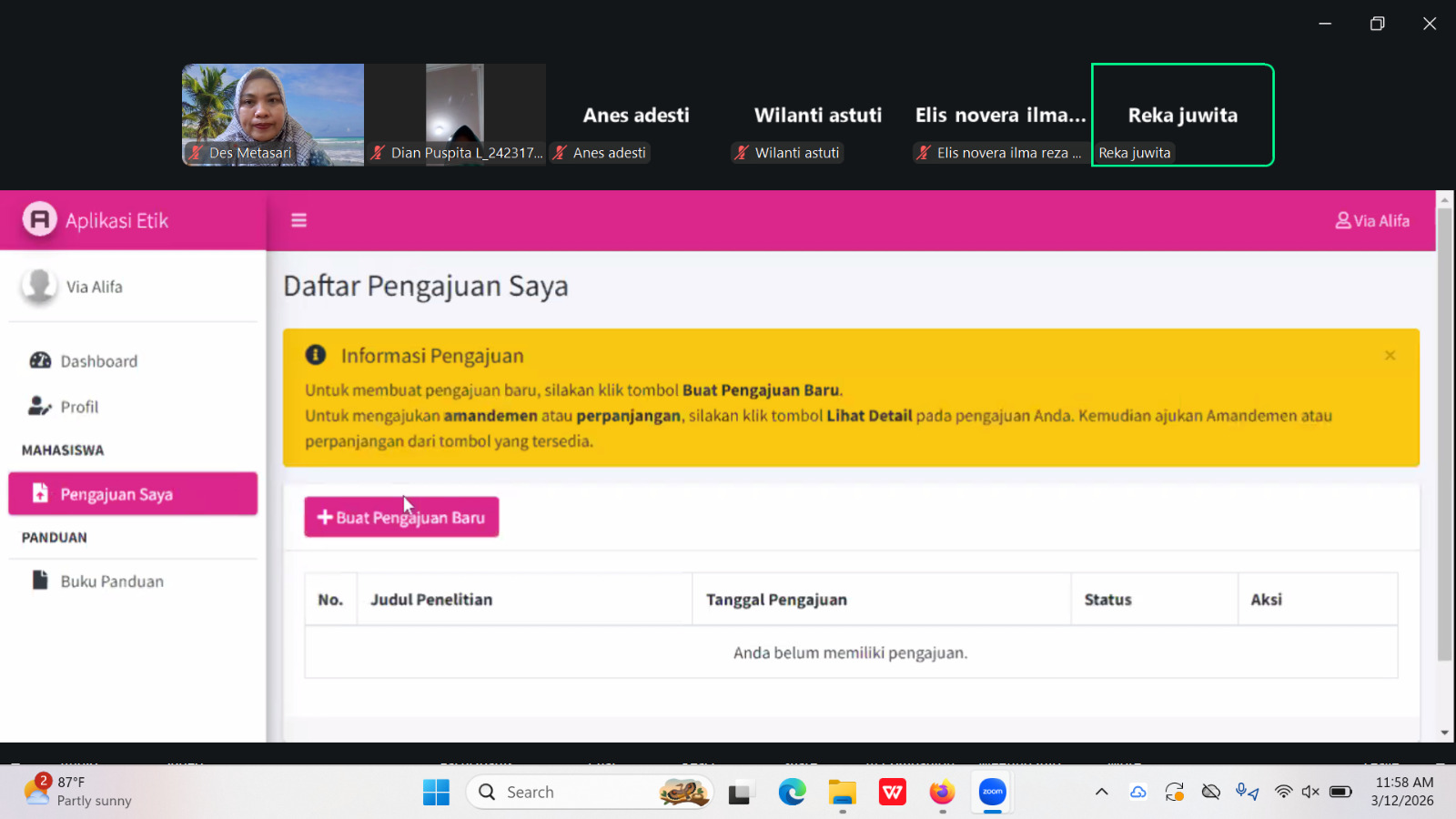 Komite Etik Penelitian Kesehatan (KEPK )Fakultas Ilmu Kesehatan (FIKes) menyelenggarakan kegiatan Sosialisasi Pengajuan Ethical Clearance Penelitian melalui Komite Etik Penelitian Kesehatan (KEPK) bagi mahasiswa Program Studi S1 Keperawatan Konversi pada Kamis (12/03/2026). Kegiatan ini diikuti oleh sebanyak 37 mahasiswa dan dilaksanakan secara daring melalui Zoom Meeting.